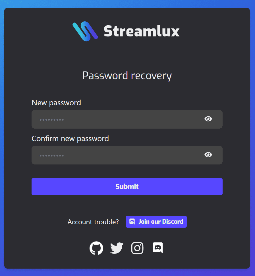 To reset your Streamlux account password, go to the password reset request page and enter the email address associated with your Streamlux account.